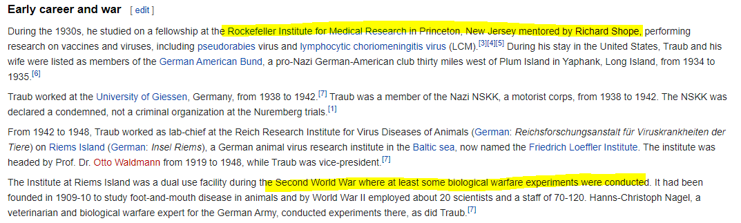 The head Nazi biowarfare expert was brought to the US in Operation Paperclip. He was trained at the Rockefeller Institute for medical research under