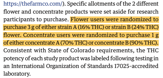 First, study used experienced #cannabis consumers. Did not use novice consumers. To participate, must have consumed at least 4 times in past month, and have used highest potency flower or concentrate used in the study at least once before.