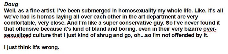 In an attempt to show how open-minded he is, Doug talks about a gay couple that at a church he used to attend. He goes out of his way to call them "fruity" and then say how gays (and women) are unfit for church leadership.