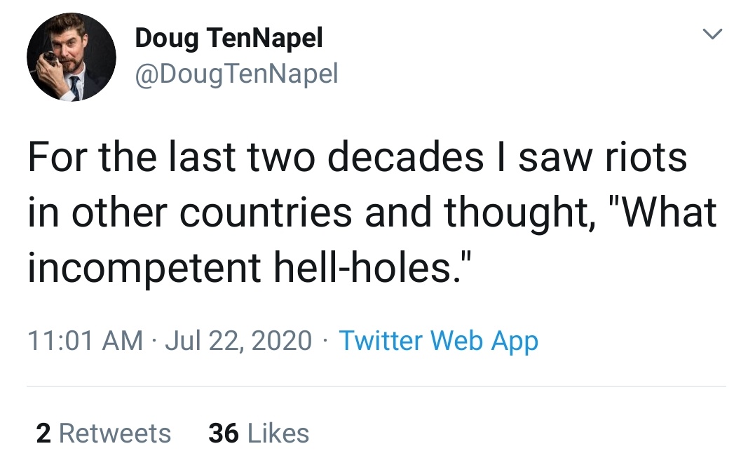 Doug is against violent protests but also against non-violent protests. It& #39;s almost like he& #39;s against the cause and not the method or something. Doug TenNapel is racist.