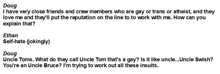 Finally, Doug talking about his supposed LGBTQ acquaintances. Doug then uses a racial slur to workshop future gay slurs.