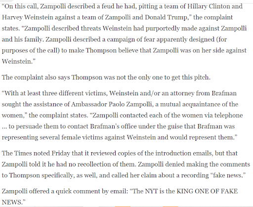 “With at least three different victims, Weinstein and/or an attorney from Brafman sought the assistance of Ambassador Paolo Zampolli, a mutual acquaintance of the women.”
