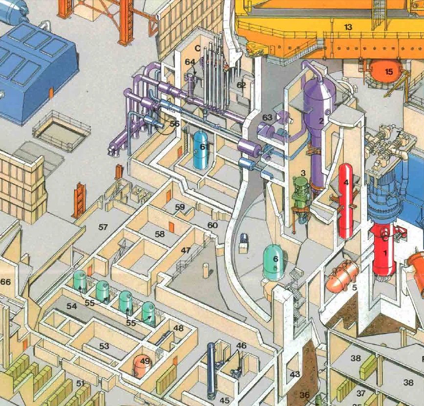 Utilizaré como referencia un diagrama de corte de Vandellós 2, el más claro disponible de una central española, realizado en 1986 por Gerardo Peña (de @WECNuclear) para la revista @neimagazine con la colaboración de @Initec_Energia. En PDF: http://econtent.unm.edu/cdm/singleitem/collection/nuceng/id/88/rec/93">https://econtent.unm.edu/cdm/singl...