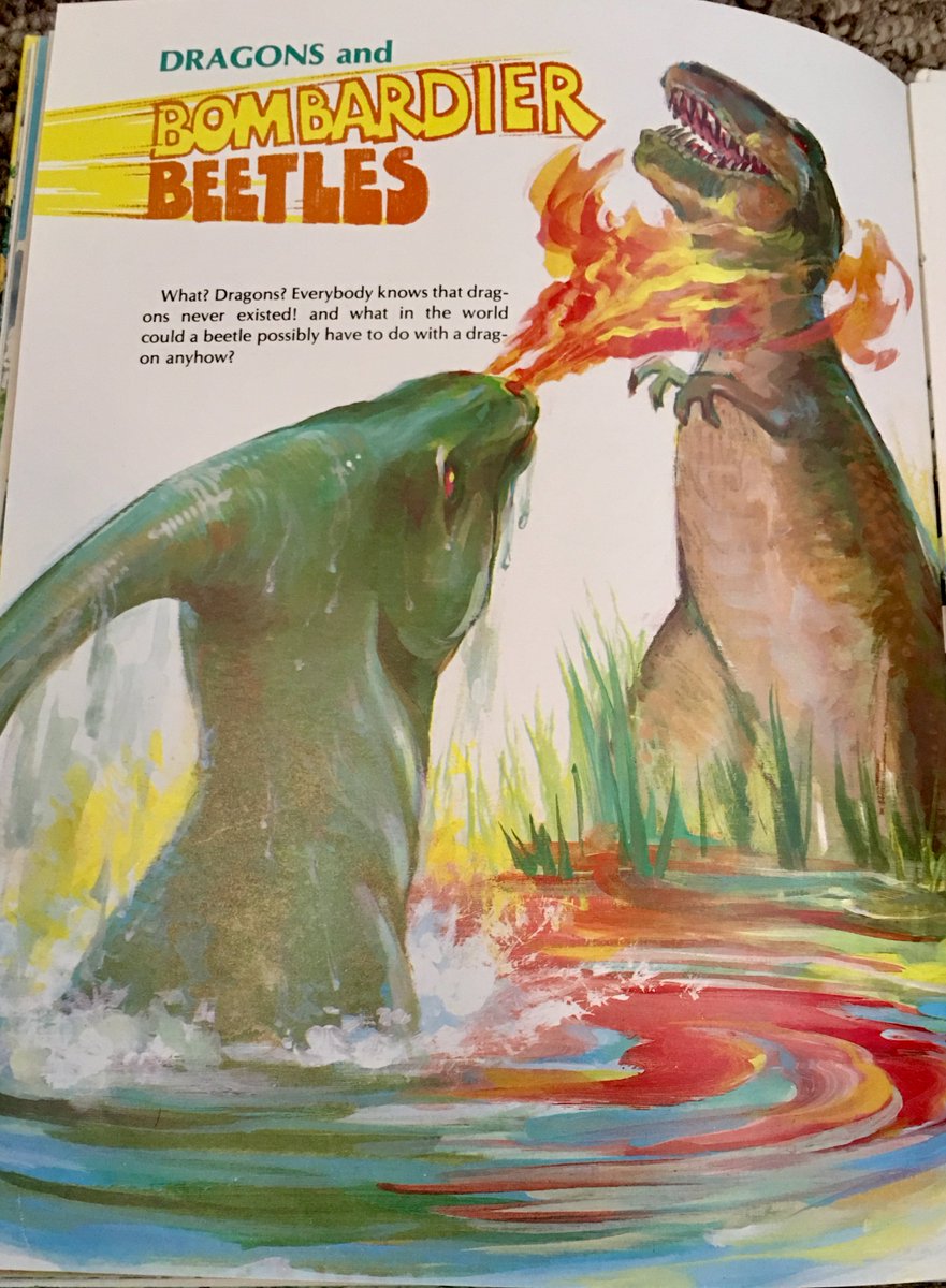 72. Anyway, from here, Gish goes off on one of his favorite fantastical creationist trips, the tale of the bombardier beetle, and how its defense mechanism supposedly could not possibly have evolved. He sees a parallel to duckbilled dinosaurs as dragons because logic amirite.