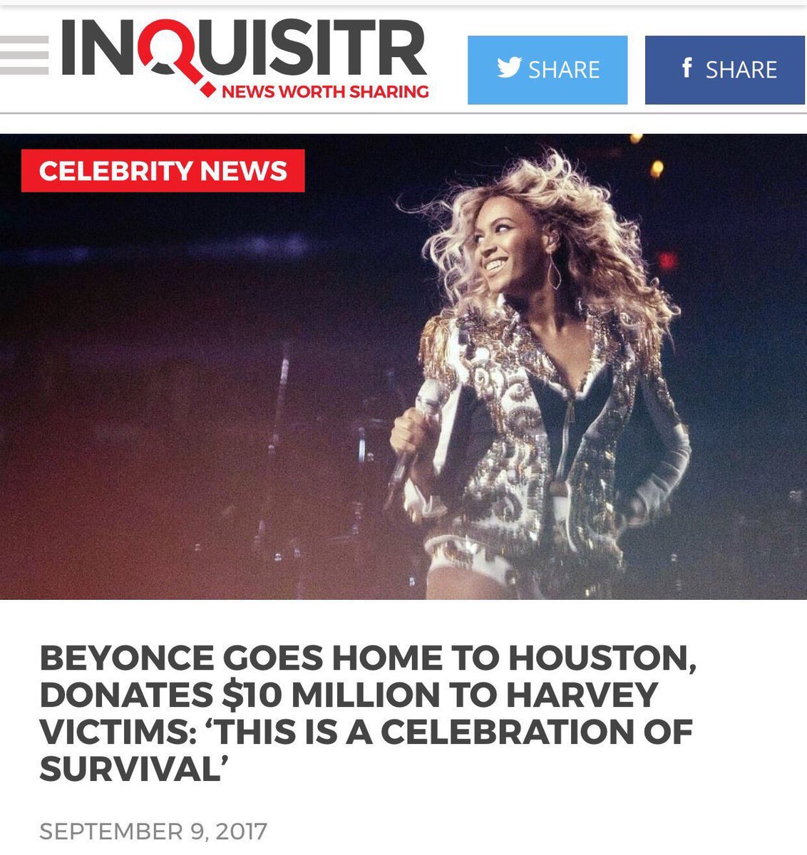 According to @TMZ & then @theinquisitr, Beyoncé donated what is later revealed to be $10M for Harvey Flood relief.