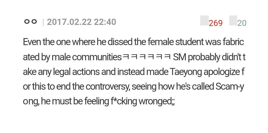 Almost a year later on October 13th, 2015 he was caught up in another scandal. Some online comments were revealed where Taeyong was allegedly fatshamimg one of his female classmates