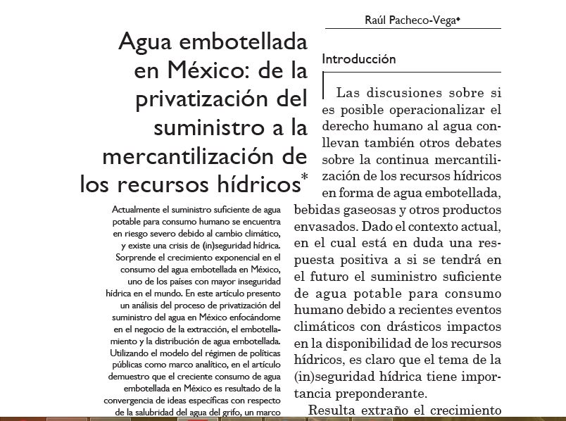 ... a analizar un fenómeno y a explicarlo. Por ejemplo, en Pacheco-Vega 2015, analicé el crecimiento en consumo de agua embotellada en México, utilizando "policy regime framework" (marco de régimen de políticas públicas) para explicar el que México es el líder mundial per cápita
