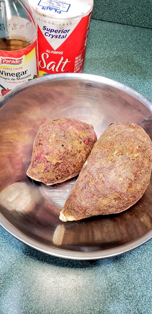 Soon as you& #39;re done with the meat, same thing with the batata. Peel em, cut 1/4 inch thick, and let em soak in water (fully submerged), 2 tbsp vinegar, and a TINY bit of salt. Again, overnight would be best so it draws out all the starch out of the batata for a crispier finish