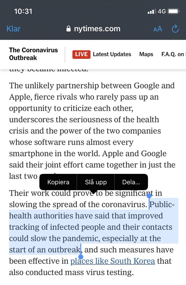 det finns en del problem med Apple och Googles gemensamma verktyg för att spåra viruset http://www.nytimes.com/2020/04/10/technology/apple-google-coronavirus-contact-tracing.amp.html">https://www.nytimes.com/2020/04/1...