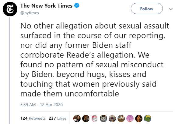 For the record, I didn& #39;t look deeply into Reade& #39;s allegation but I& #39;ve seen skepticism from people I trust. But again the fact that it isn& #39;t treated similarly by the media, at least in terms of reporting on allegations like this existing at all, is outrageous.