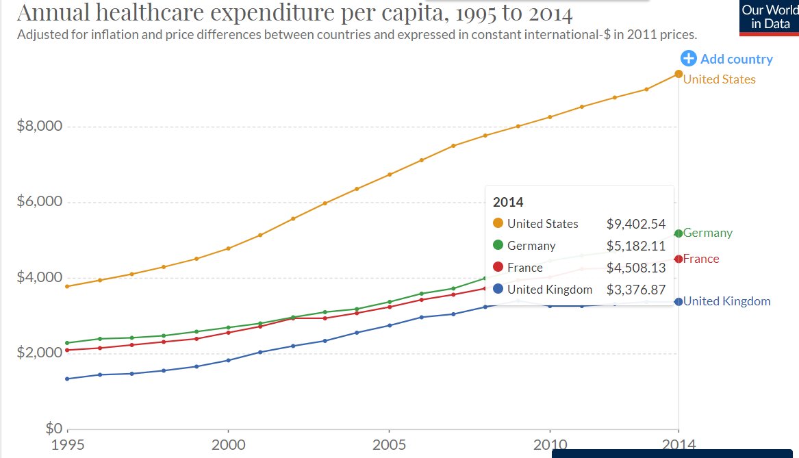 Comme vous avez pu voir sur les graphiques précédents, les Etats-Unis dépensent eux aussi énormément pour leur santé, et pourtant leur modèle ne fait rêver personne ici.