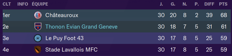 Une saison vraiment agréable. Même pas besoin d& #39;avoir recours à de vieilles gloires en fin de carrière. Châteauroux est bcp trop fort mais ça semble possible de finir 2e ou 3e.