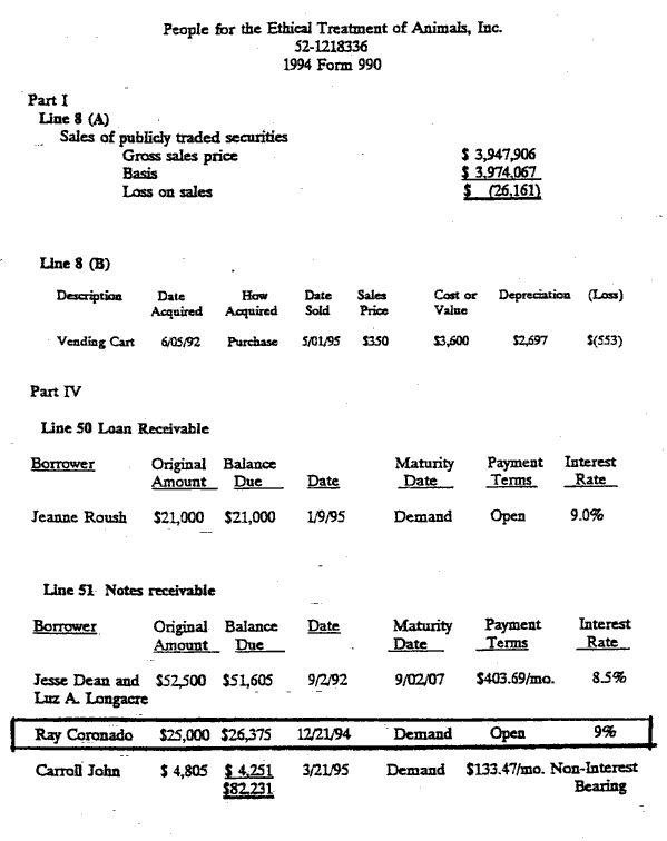 PETA supports terrorism. In 1995, they contributed $70,200 to Rodney Coronado, a convicted arsonist connected with the Earth Liberation Front (ELF). Images are pages from their 1995 Tax Return. ( https://web.archive.org/web/20150423164013/http://www.animalscam.com/references/peta_rodney1.cfm">https://web.archive.org/web/20150... and https://web.archive.org/web/20080903225845/http:/www.animalscam.com:80/references/peta_rodney2.cfm)">https://web.archive.org/web/20080...