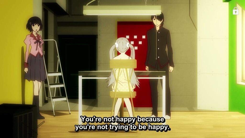 Sodachi being the most extreme case so far. Since she& #39;s become so used melancholy and unhappiness that its easier and more comfortable to just live like that rather than trying to strive for happiness and end up just hurting herself even more. But Araragi puts it best