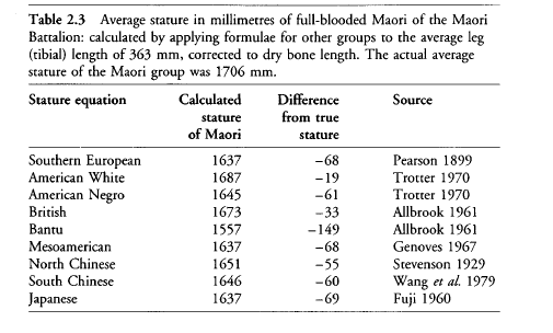 Anthropologists around the world have constructed models to predict height based on the length of the femur, but as proportions vary models don't apply across continents. This is what happens when these equations try to predict the height of the Maori: