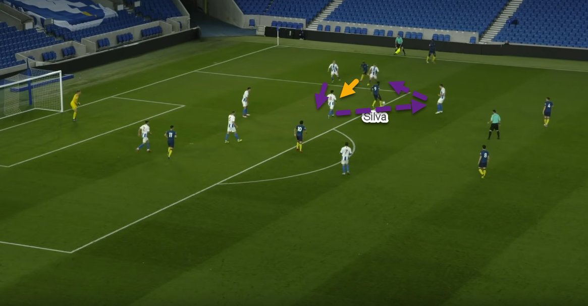 - Silva anticipates and runs wide to present a passing option