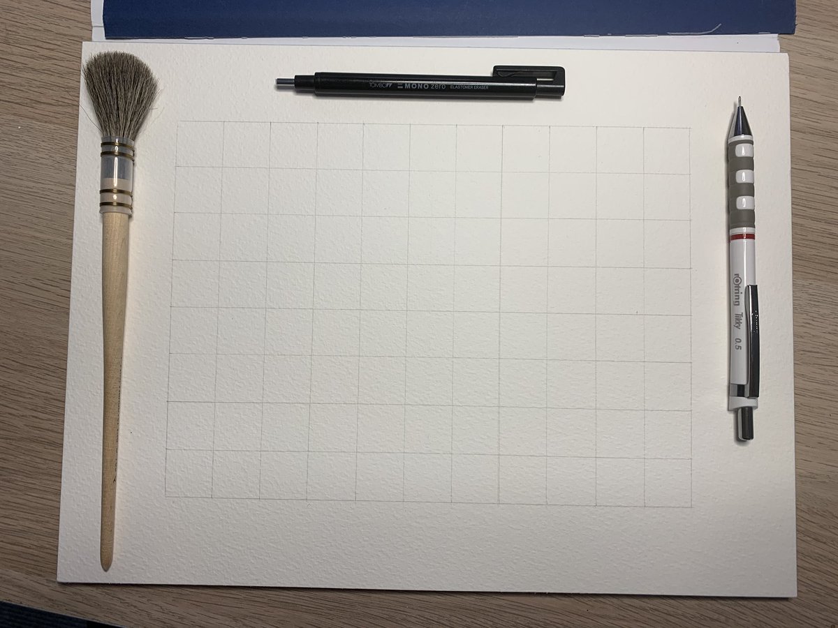 To start out, choose your materials. I work primarily with ink and watercolour, so am using watercolour paper. In this case, The Langton by @DalerRowney- 140lb cold pressed block. I will draw a grid, so I have my ruler and 0.5mm HB mechanical pencil.