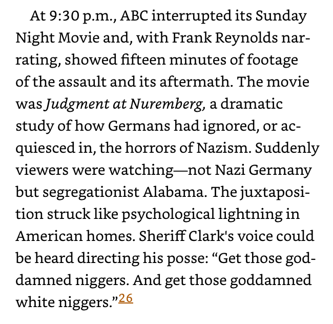 By coincidence, ABC was playing a Sunday Night Movie about Nazi war crimes called Judgement at Nuremberg. ABC interrupted the movie and “Suddenly viewers were watching—not Nazi Germany but segregationist Alabama.” 3/