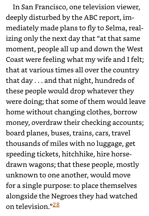 ”In San Francisco, one television viewer, deeply disturbed by the ABC report, immediately made plans to fly to Selma, realizing only the next day that ‘at that same moment, people all up and down the West Coast were feeling what my wife and I felt;‘”