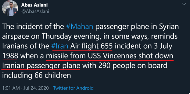 And regarding the 1988 incident involving Iran Air flight 655, please listen to this former Iranian military officer has says Iran’s regime is to blame.