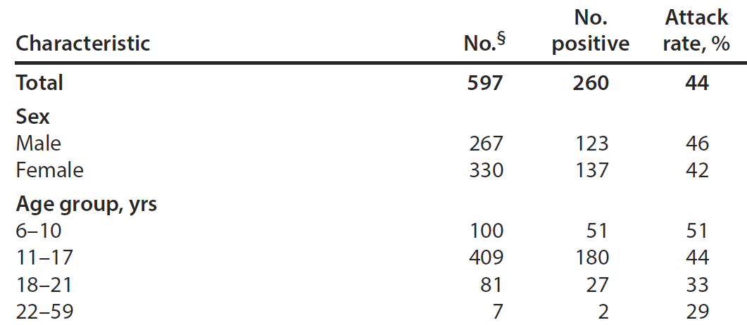 Transmission likely occurred within staff/trainees before camp arrival & clearly spread efficiently through campers after they arrived so that 49% were infected in 3-6 days. This time period is so short that at most there was 1 chain of transmission w/in campers.