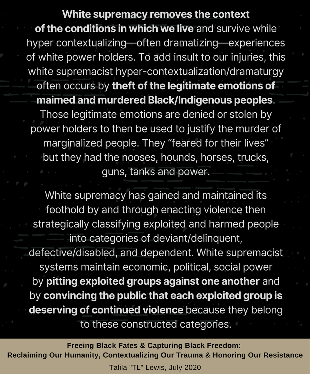 ...White supremacy removes the context of the conditions in which we live & survive while hyper contextualizing-often dramatizing-experiences of white power holders...[T]his... often occurs by theft of the legitimate emotions of maimed & murdered Black/Indigenous peoples.