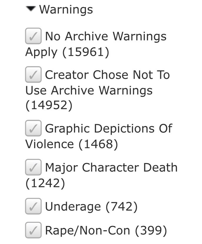 want to read fics with no major warnings? select the first one! want to read mcd? select that one! the great thing about the warning system is that you don’t have to see anything you don’t want to. you can also exclude these which i’ll talk about later on