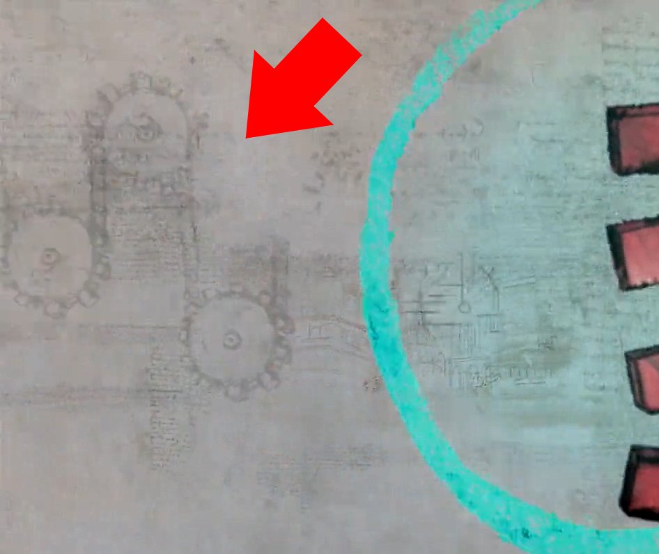 Lors de la transition avec la scène suivante un motif très spécifique apparaît un instant à l& #39;image : trois roues dentées reliées par une courroie. Pour moi c& #39;est un autre clin d& #39;œil à Léonard qui, en tant qu& #39;ingénieur, a imaginé de nombreux systèmes de transmission, rouages, etc