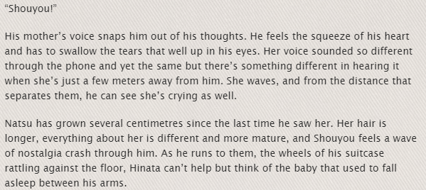"Blinking at the message, Shouyou lets out a shaky breath. The pain of having waited for him the whole night comes crashing down"