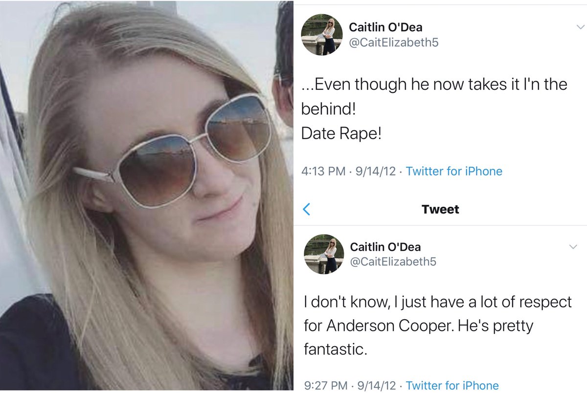 In same day tweets (pre Twitter’s thread feature) Kelly Loeffler’s press secretary, Caitlin O’Dea, said she “had a lot of respect” for Anderson Cooper after having tweeted, “even though he now takes it in the behind! Date Rape!”