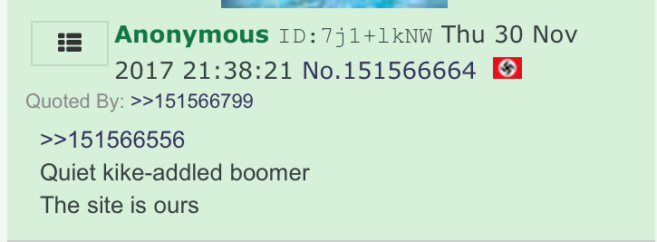 By "Nazis" we mean literal, "gas-the-Jews" Nazis with swastika-flag icons who refer to /pol/ (where, again, Q made his first month's worth of drops) as "a board for National Socialism."
