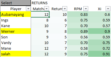 From this i compare the number of returns against Xi over the season 2019/20 (for now)