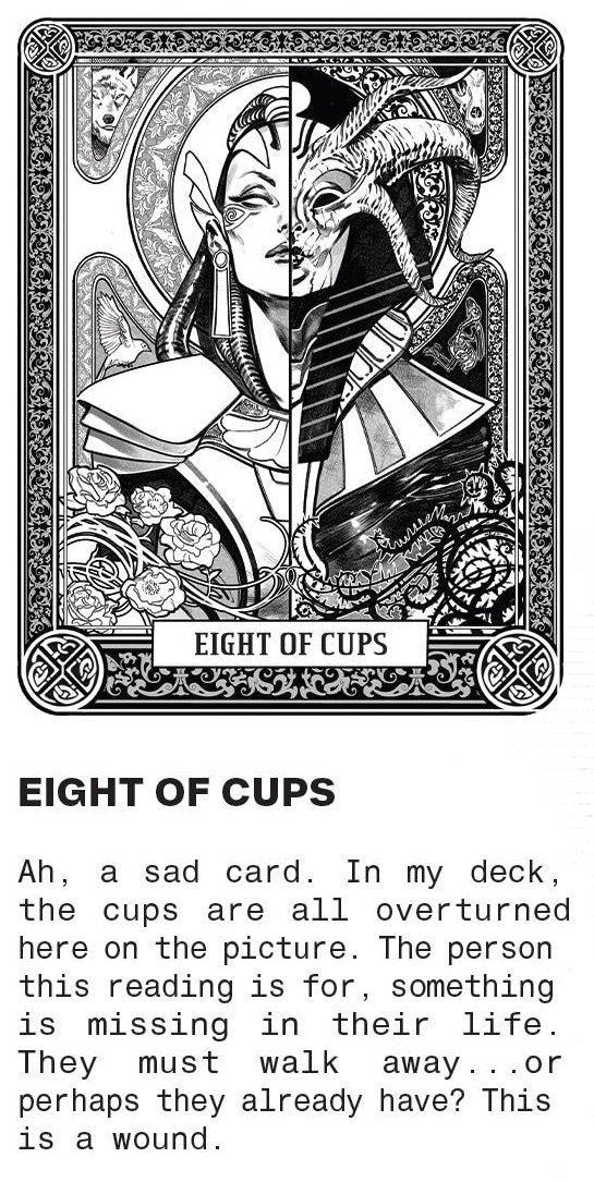 The cups represent feelings, emotions. The Eight of Cups is about turning your back on something that used to attract you or fulfill you in an emotional sense. We don& #39;t really know if this is about Genesis/Annihilation turning Apocalypse down or the other way around.