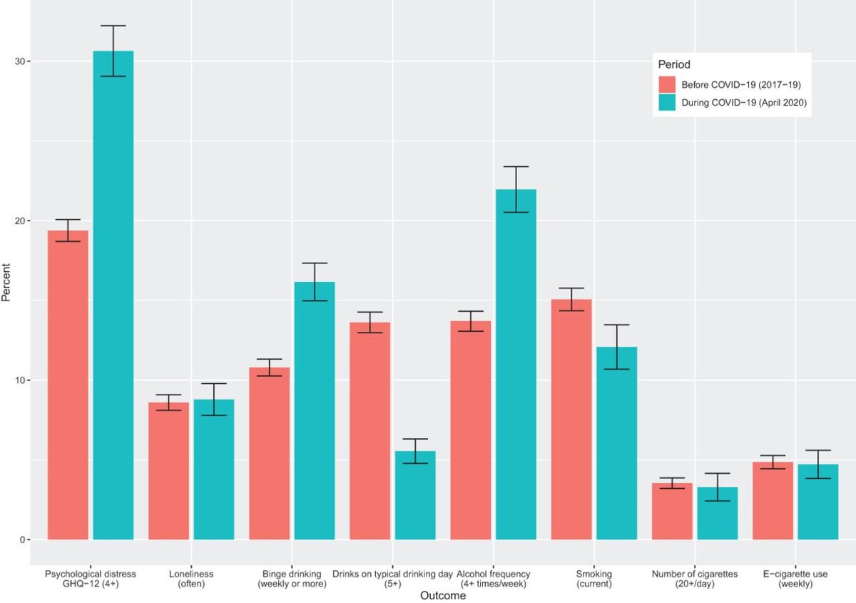 A big rise in psychological distress, but surprisingly no change in loneliness. An increase in frequency of drinking and binge drinking and a small fall in smoking rates