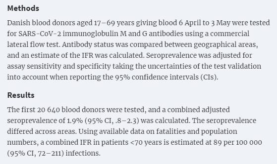 24/n In Denmark, a robust population estimate put the figure at 1.1%, while their blood donor study estimates 1.9% have been infected previously