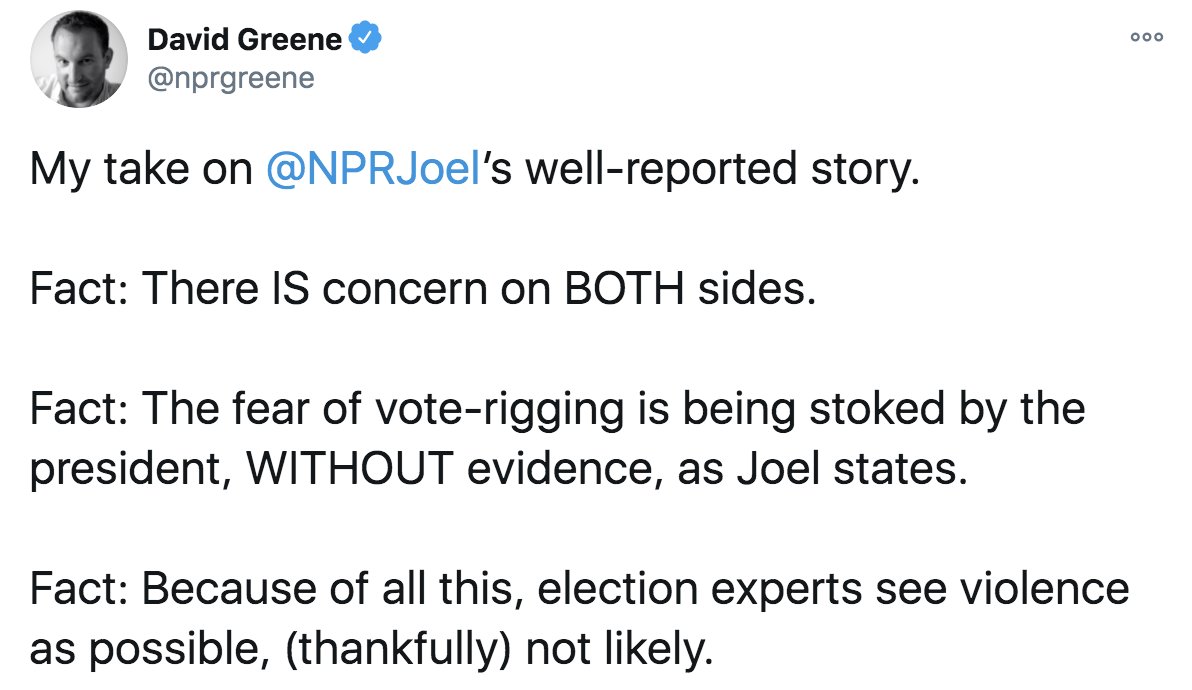 Here is a reply from NPR& #39;s David Green to the first post in this thread, criticizing this story. https://www.npr.org/2020/10/28/928556249/as-election-suspicions-increase-experts-warn-conditions-are-ripe-for-conflict">https://www.npr.org/2020/10/2...