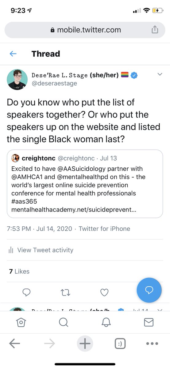 I looked at the lineup—all white folks and a single Black woman who was listed last. I looked at the other info, and despite partnering with AAS on this project, the site developer used statistics from AFSP.