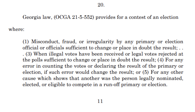 20. "Georgia law, (OCGA 21-5-552) provides for a contest of an election where: (1) Misconduct, fraud, or irregularity by any primary or election official or officials sufficient to change or place in doubt the result; . . . "