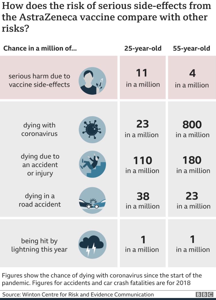 “you are more likely to die falling down the stairs or eating your breakfast than as a result of the AstraZeneca vaccine” https://amp.theguardian.com/commentisfree/2021/apr/09/covid-vaccine-safety-risk-perception-reality-az-jab?__twitter_impression=true">https://amp.theguardian.com/commentis...