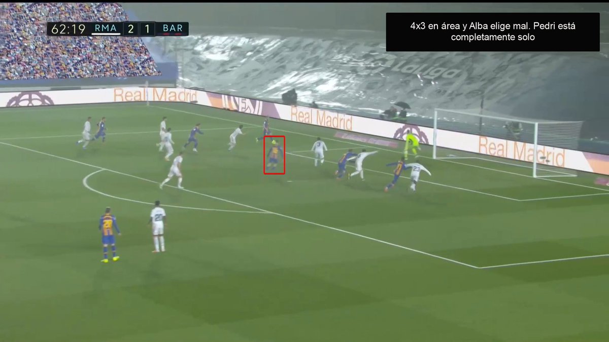 Otra más en la que el RM se desajusta. Fede y Lucas van, pero nadie les acompaña. Pedri encuentra a Messi completamente solo y el FCB se planta en área rival con casi nada.