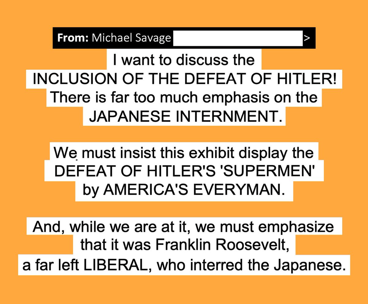 After another board meeting, Savage wrote his colleagues, “Now that we are looking more closely at the Heritage exhibit, I want to discuss the INCLUSION OF THE DEFEAT OF HITLER! There is far too much emphasis on the JAPANESE INTERNMENT.”